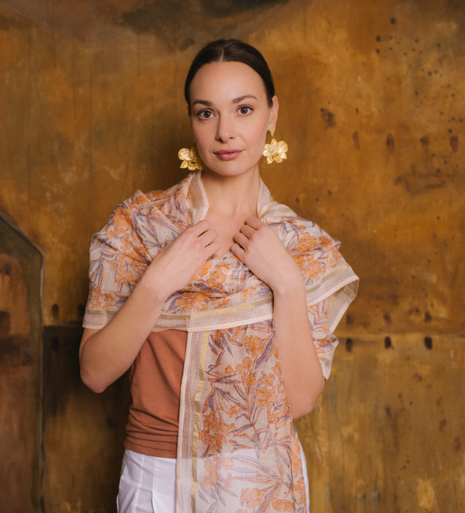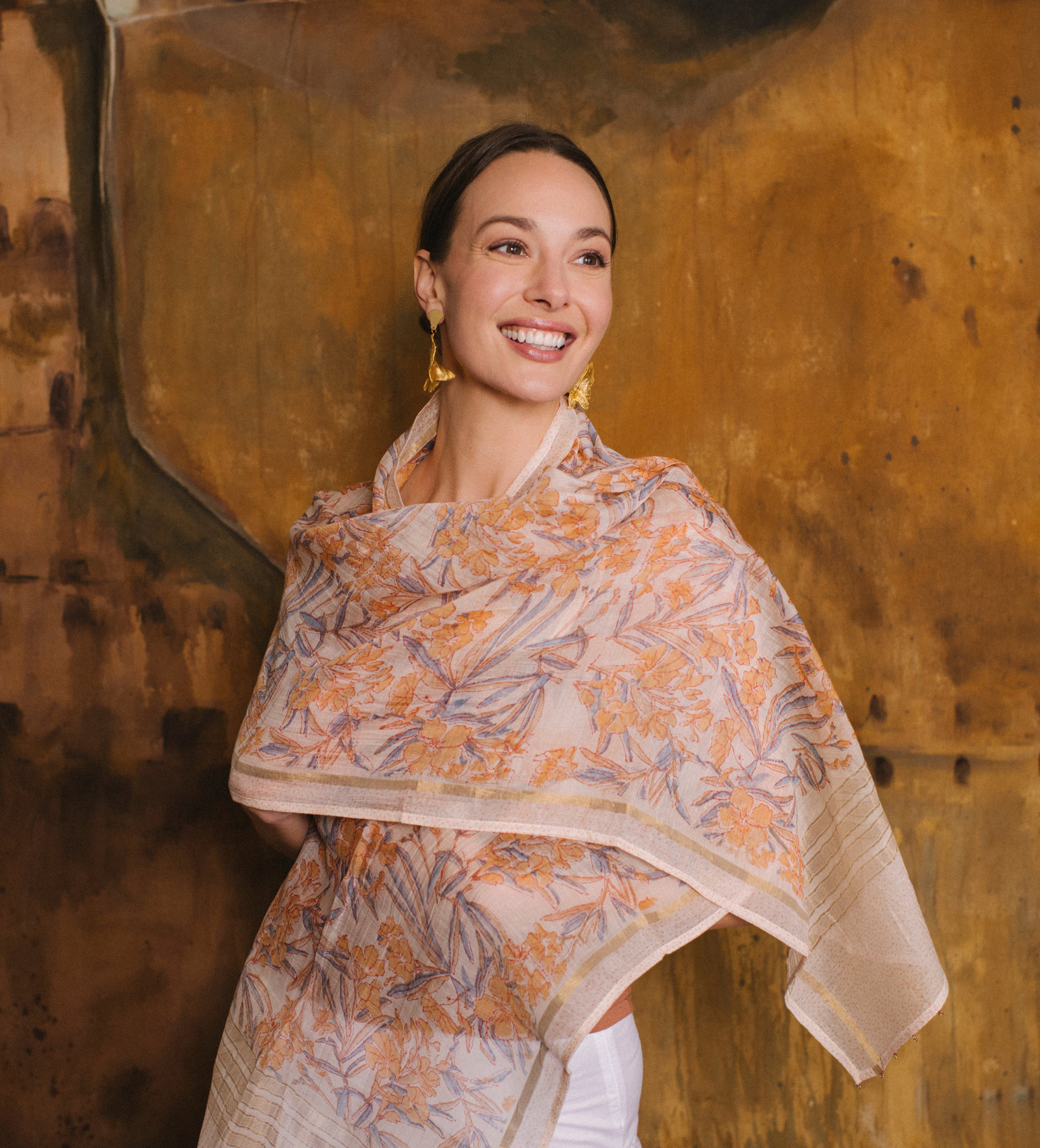 Purchased during one of Susan's trips to India. A beautiful airy scar with delicate floral print and gold details. Can be worn around the neck or draped over the shoulders.
