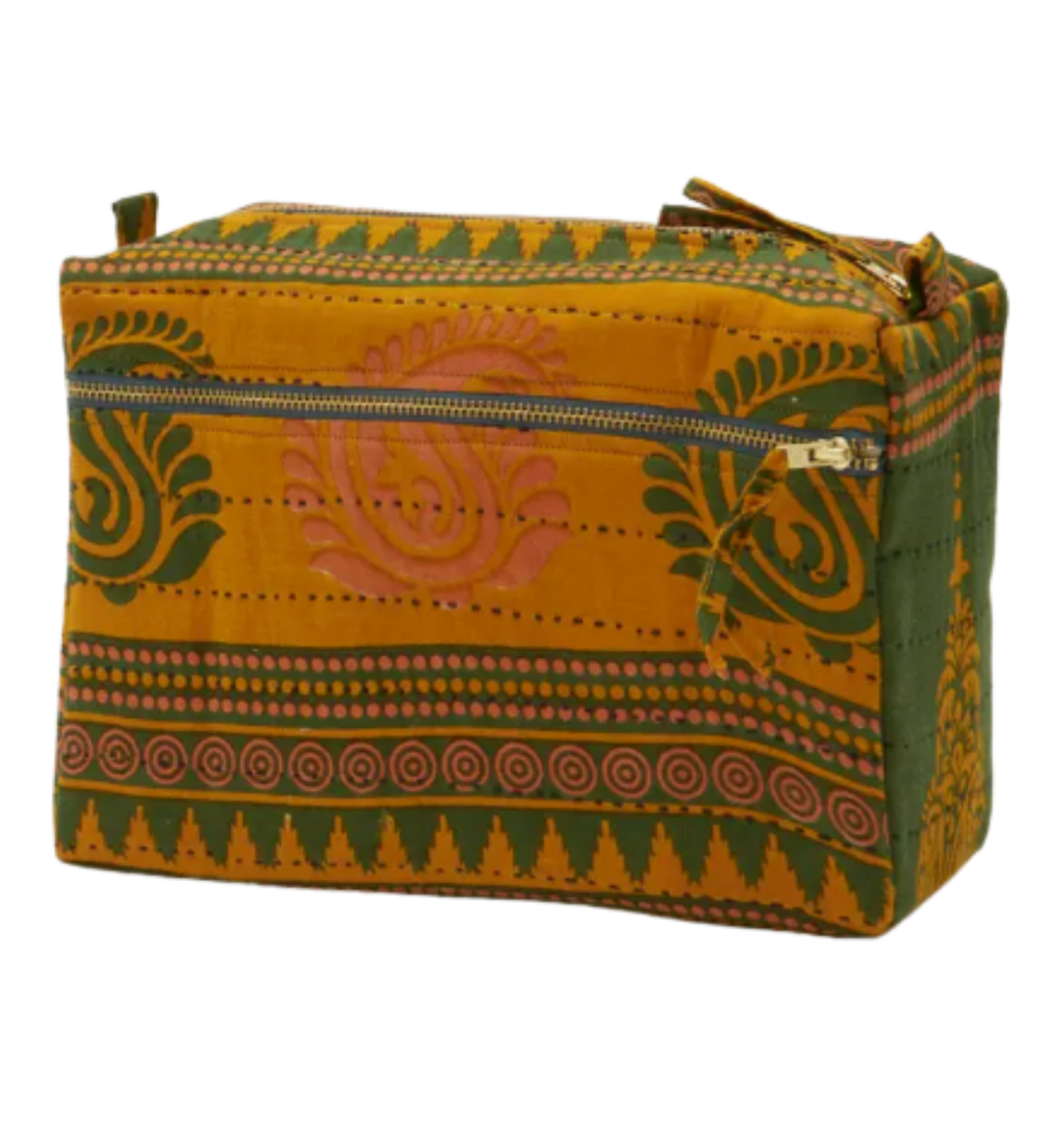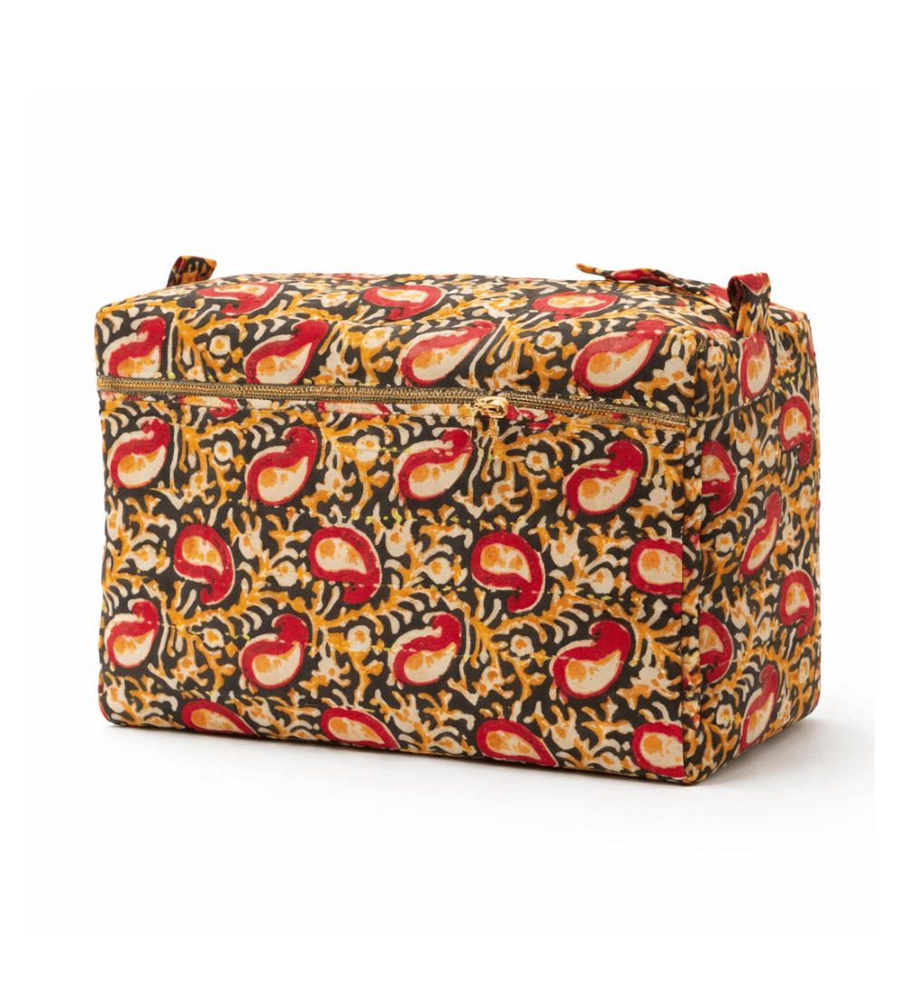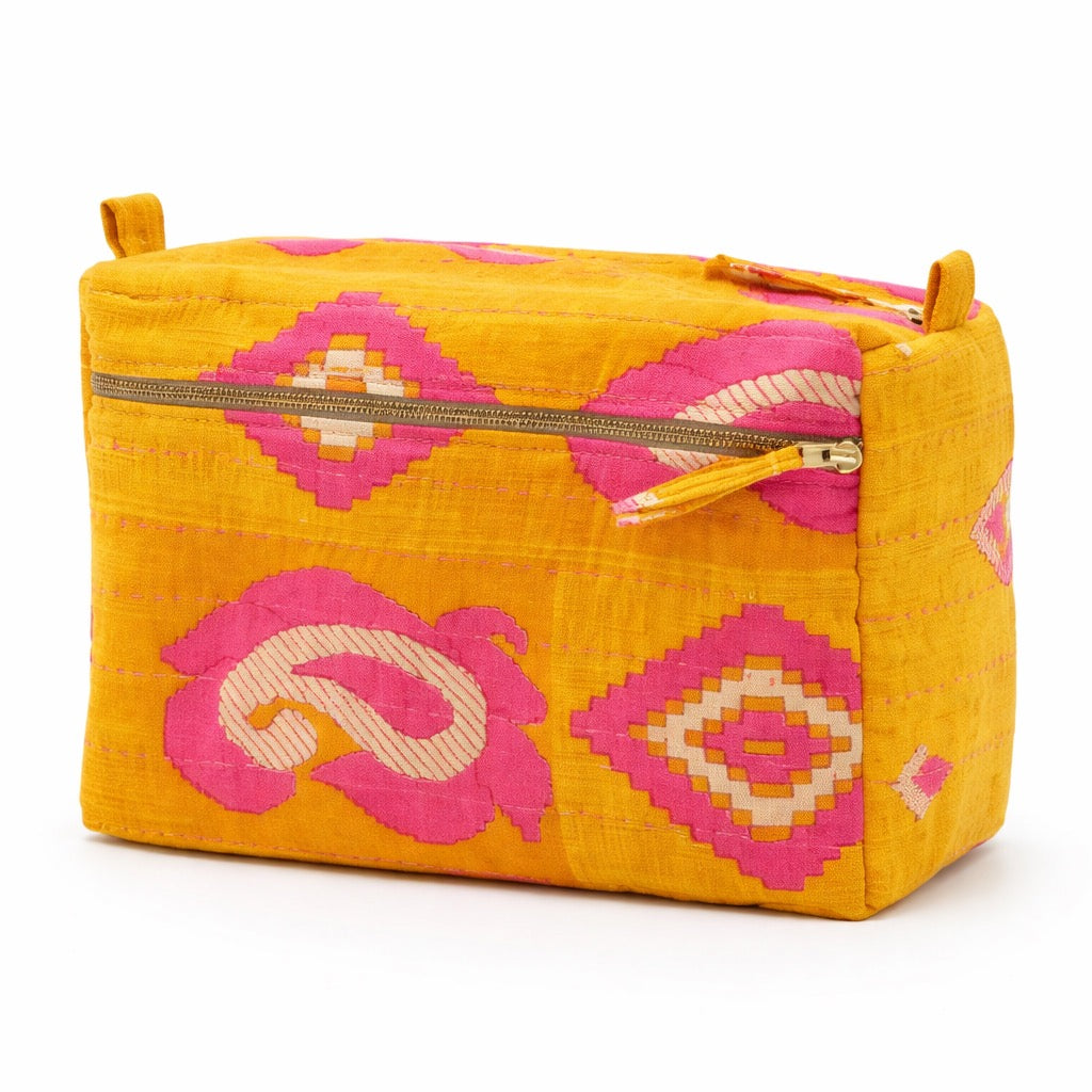 Pretty and practical with function in mind, this large toiletry bag is reimagined from one-of-a-kind vintage cotton saris. Featuring a spacious canvas-lined interior for added structure and an exterior zip pocket for extra storage, this vintage kantha toiletry bag easily tucks away in your suitcase, gym bag, or duffle bag. Handcrafted by woman in Ajmer, India.