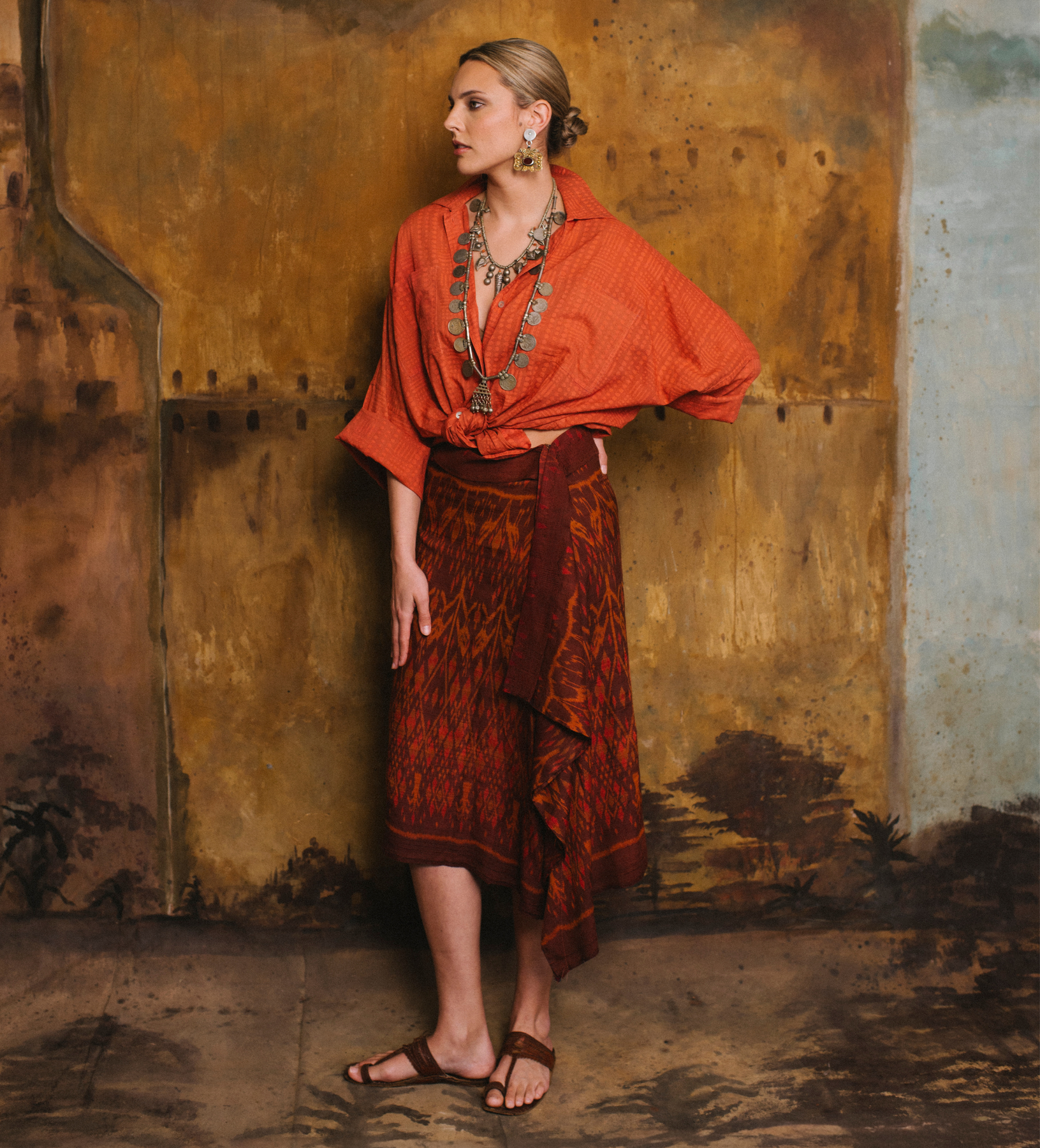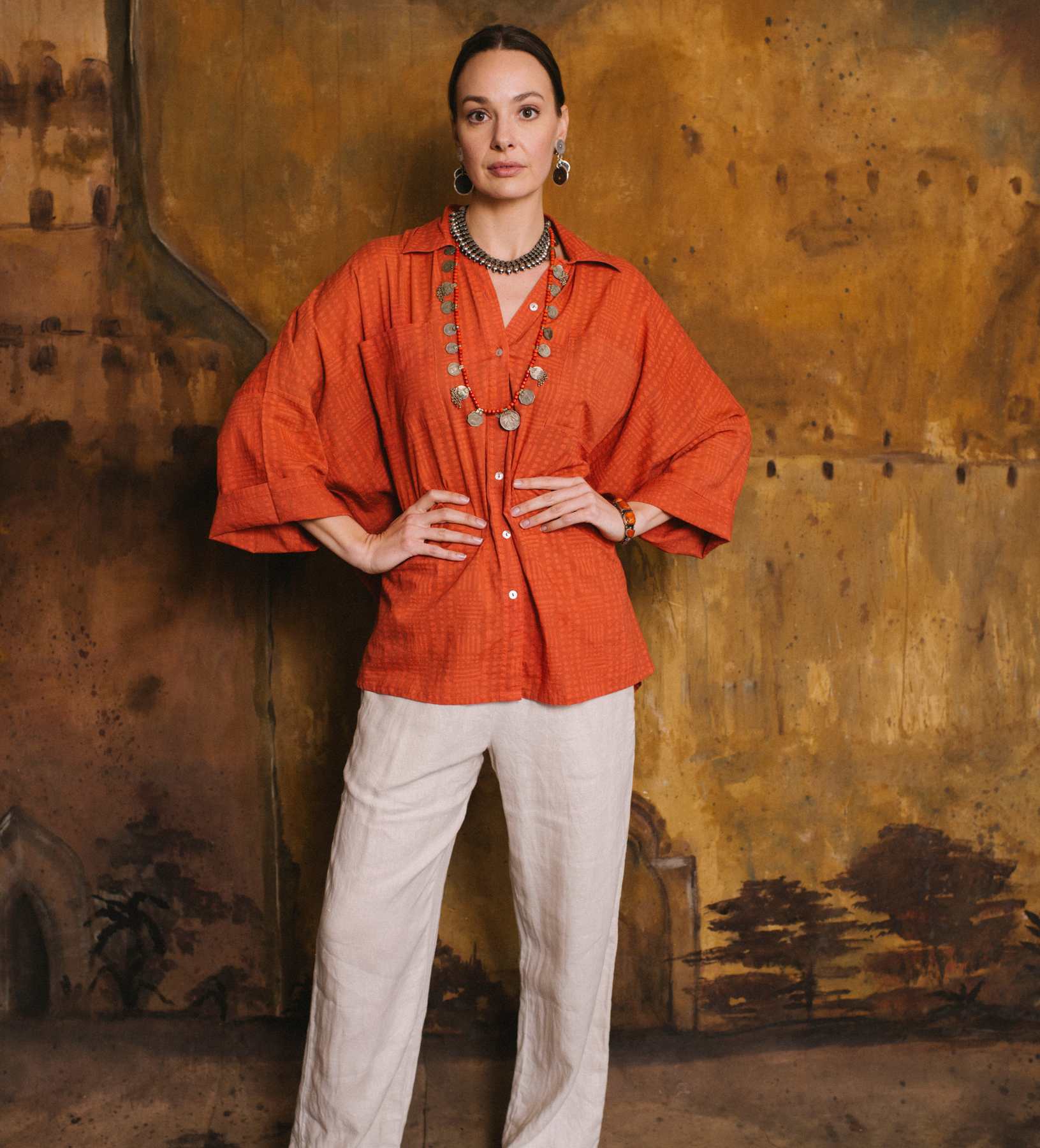 This shirt is all about a comfortable, practical & beautiful throw on to facilitate easy movement. Wear as a shirt or open as a jacket. Closes in front with mother of pearl button and patch pockets at the chest. Yarn dyed naturally using organic indigo and iron