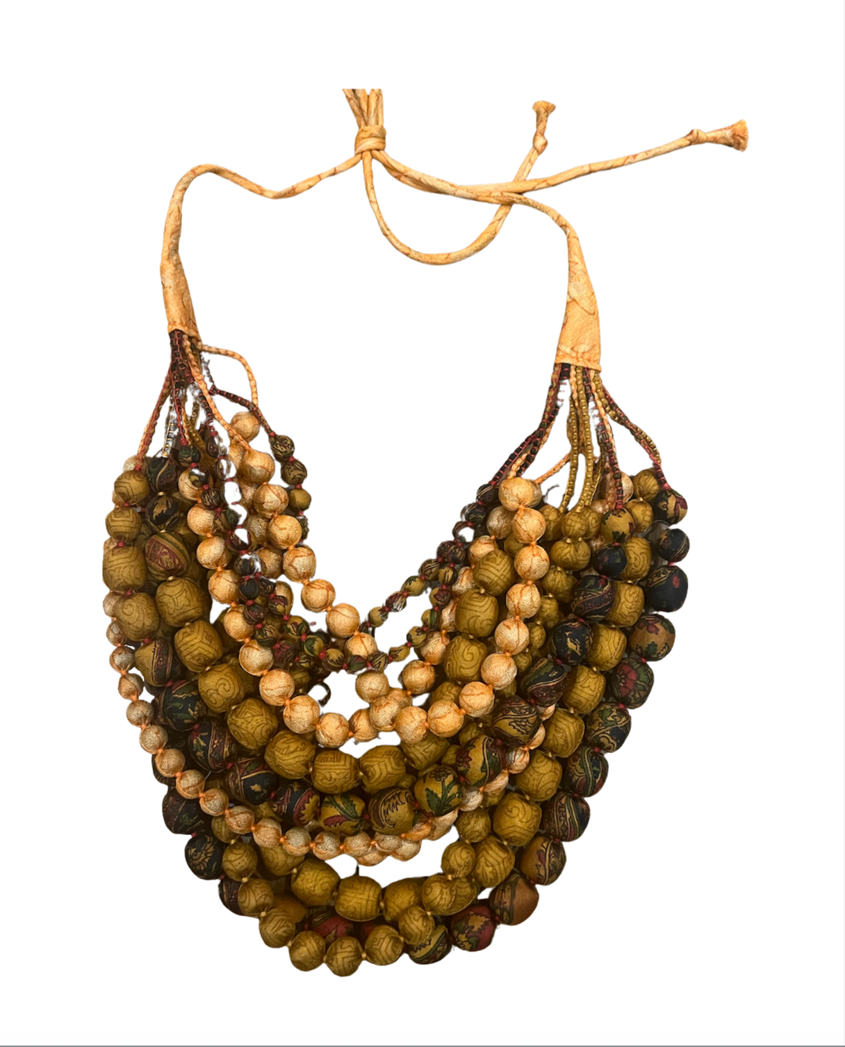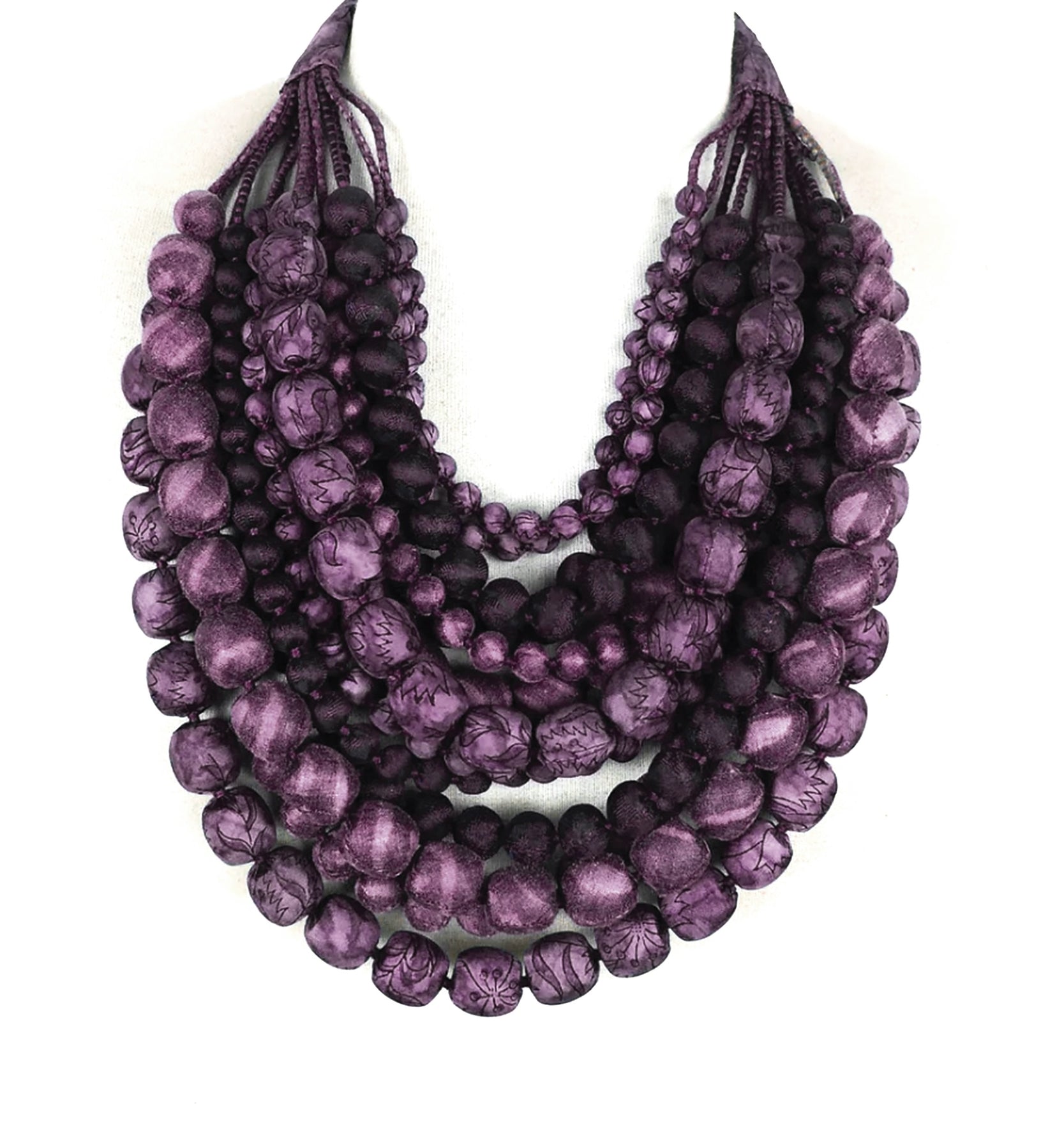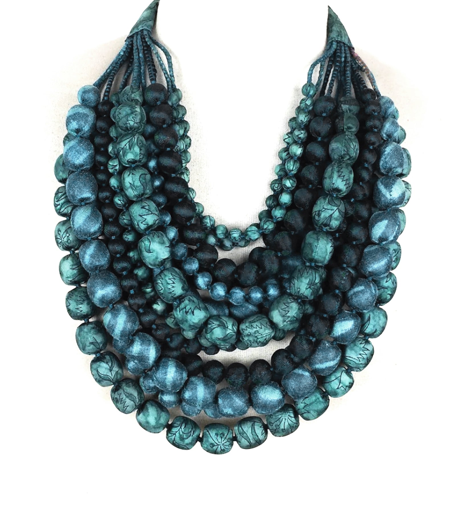 Crafted from sari fabric remnants, the artisans carefully choose each fabric with a color coordinating thread before sewing wooden prayer beads into a string of the most intoxicating fabric pearls we've ever seen. With a mixture of large and small beads, this multi strand necklace sings with inspiration of a wild melody that is so sweet to gaze upon!