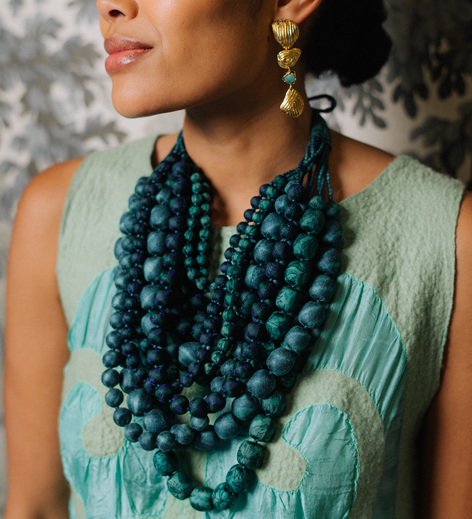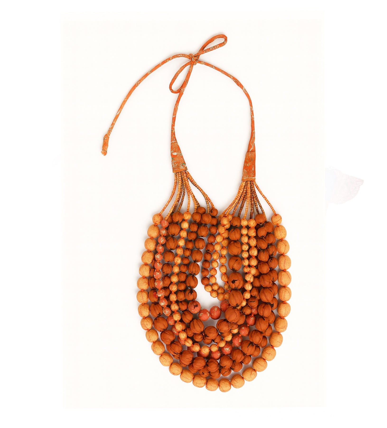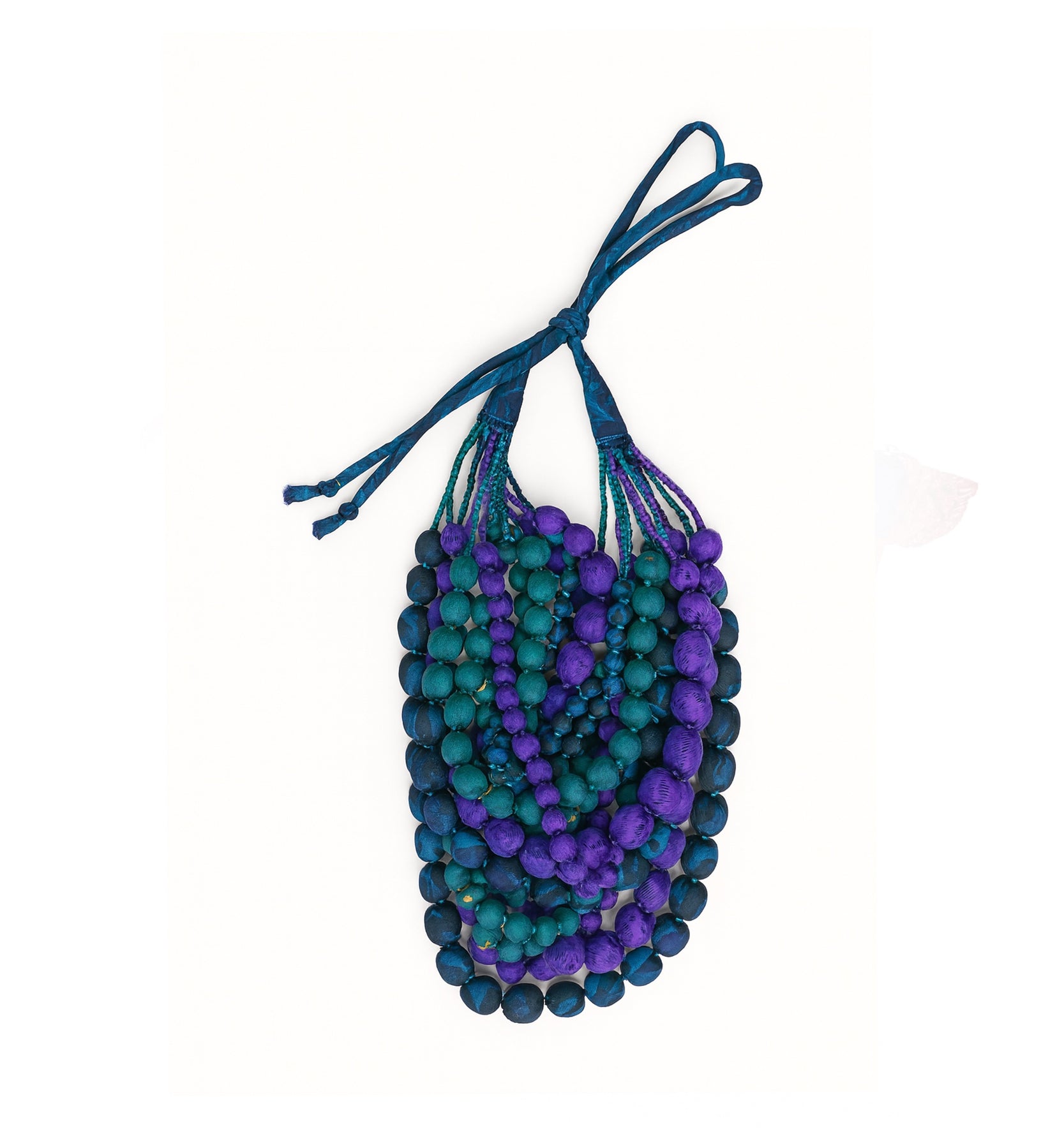Crafted from sari fabric remnants, the artisans carefully choose each fabric with a color coordinating thread before sewing wooden prayer beads into a string of the most intoxicating fabric pearls we've ever seen. With a mixture of large and small beads, this multi strand necklace sings with inspiration of a wild melody that is so sweet to gaze upon!