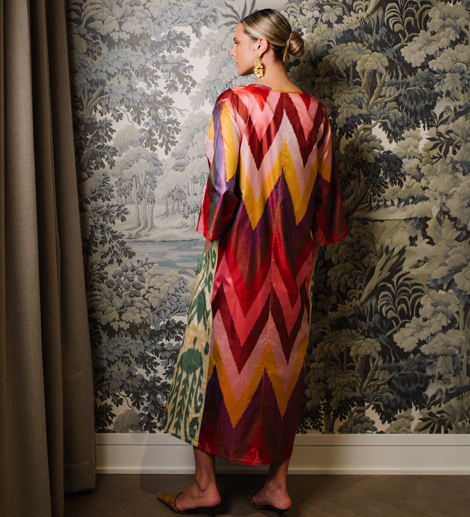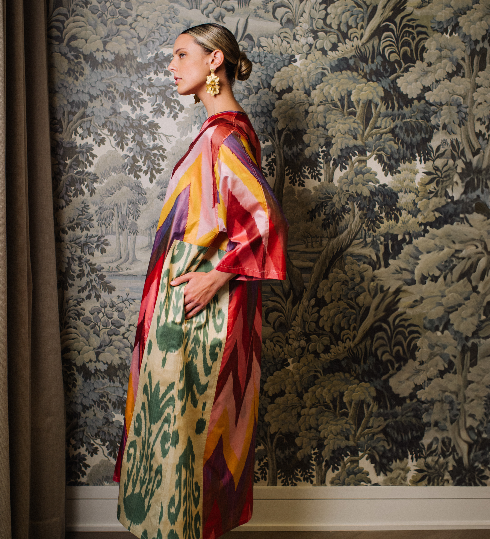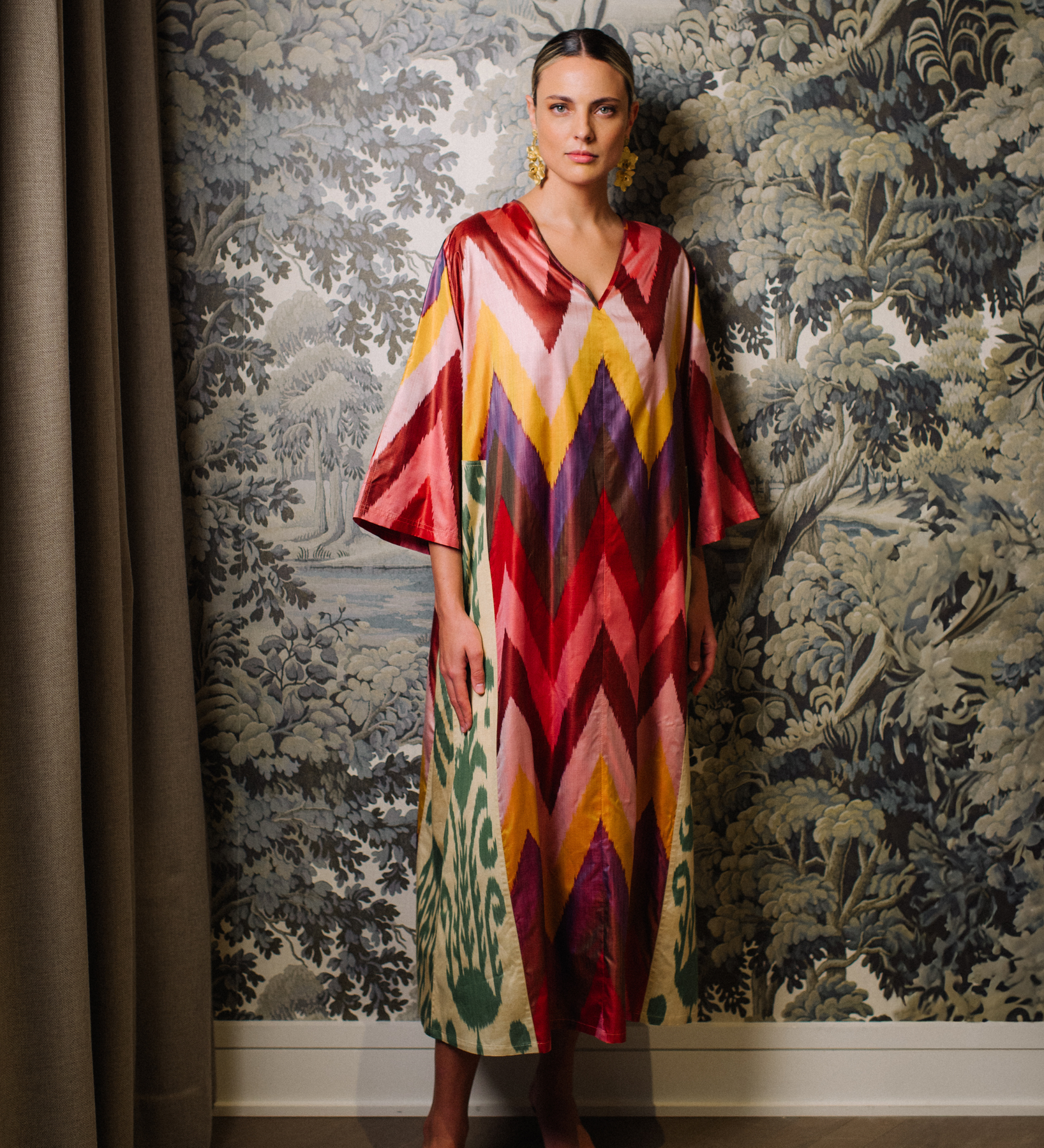 Easy, comfortable, and incredibly stylish, our voluminous caftans are silky smooth with plenty of room to play. Woven in traditional ikat fashion, each pattern is unique and blurred, forming a most delicate yet bold design.