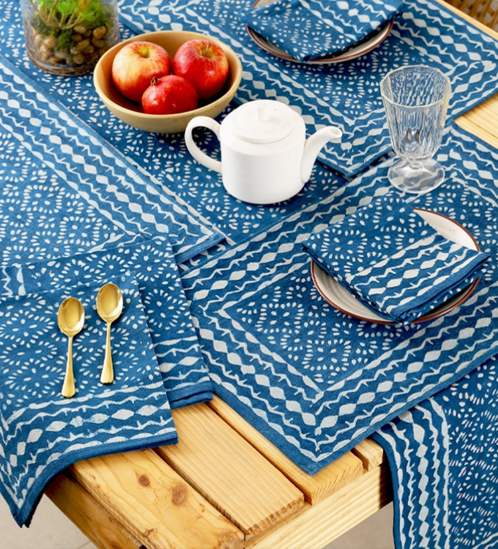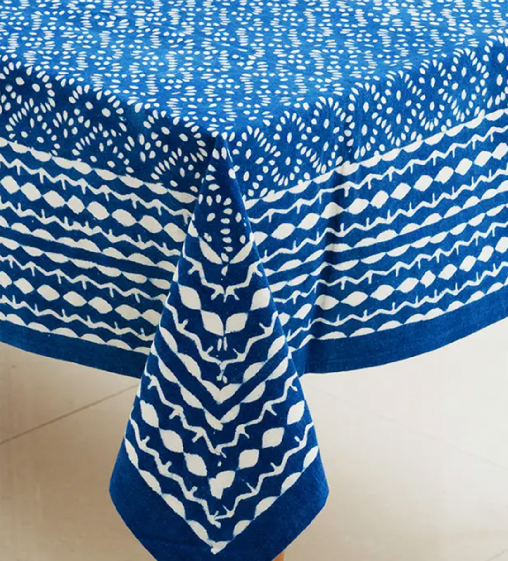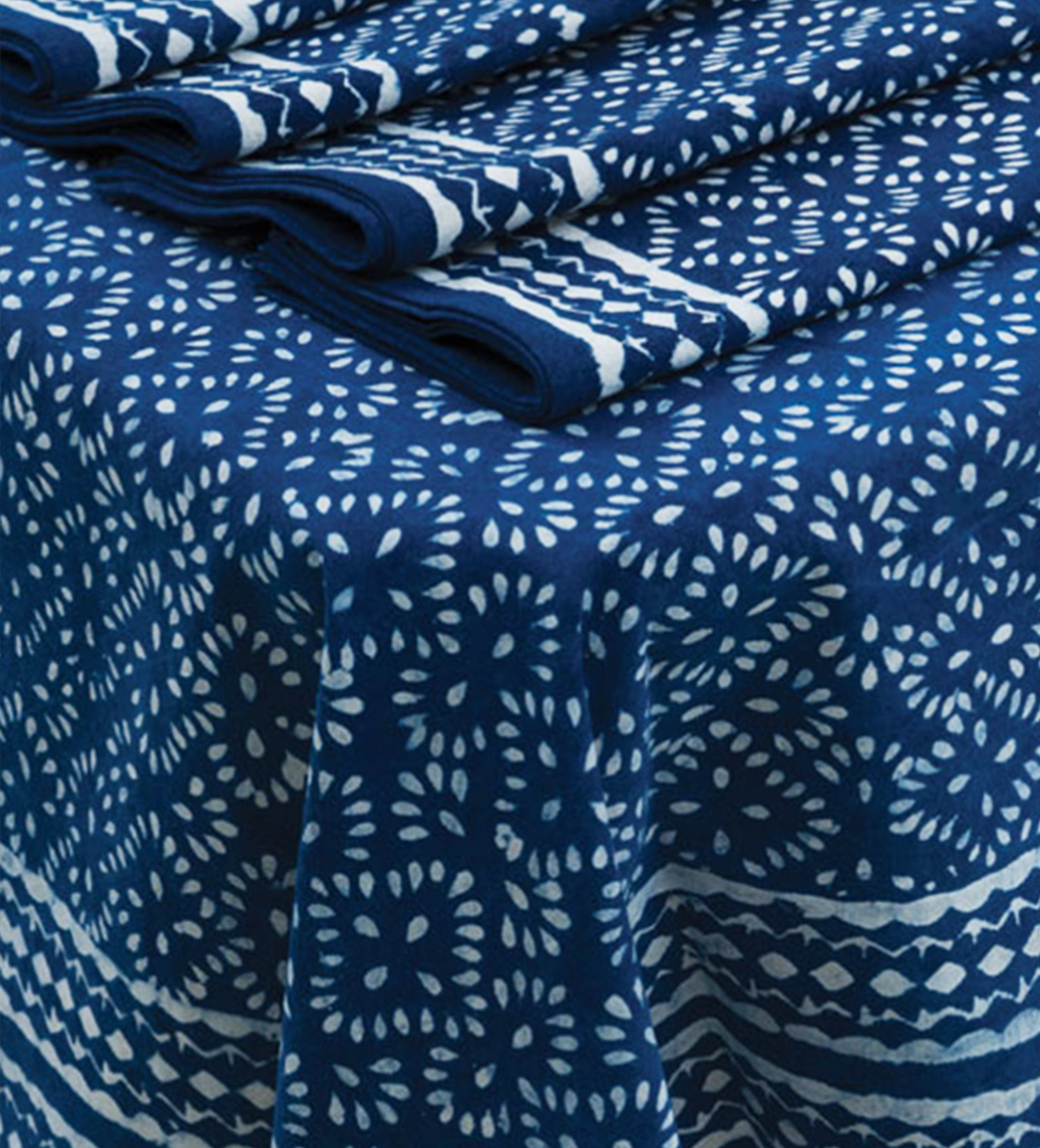 Beautiful Indigo Tablecloth is made with soft cotton that is hand block printed by artisans using the traditional mud resist printing technique known as “dabu printing”. This art form has been practiced in India for centuries and is a very intricate process involving many steps. The natural variations that occur with mud printing adds to the authentic beauty of each piece.