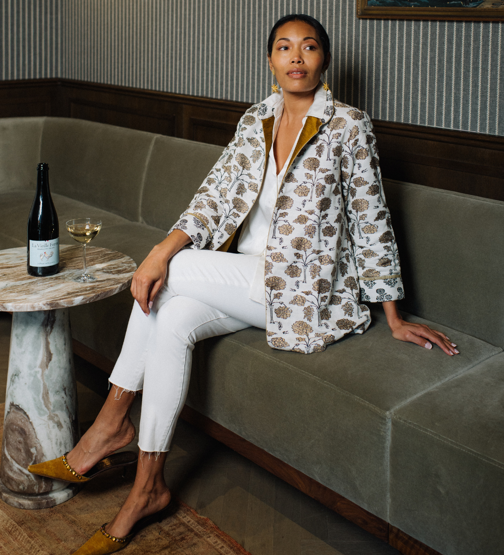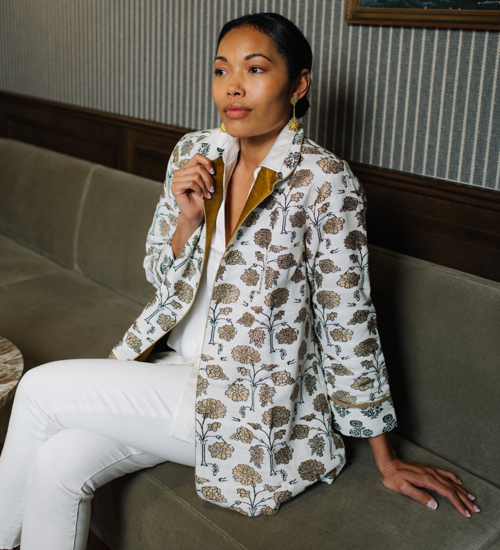 Stylist Tip: The complex design is woven by hand in a soft off-white and black silk with gold trim details, constructed and lined to a fitted silhouette. The jacket can be dressed up or down, from jeans to a slim skirt.