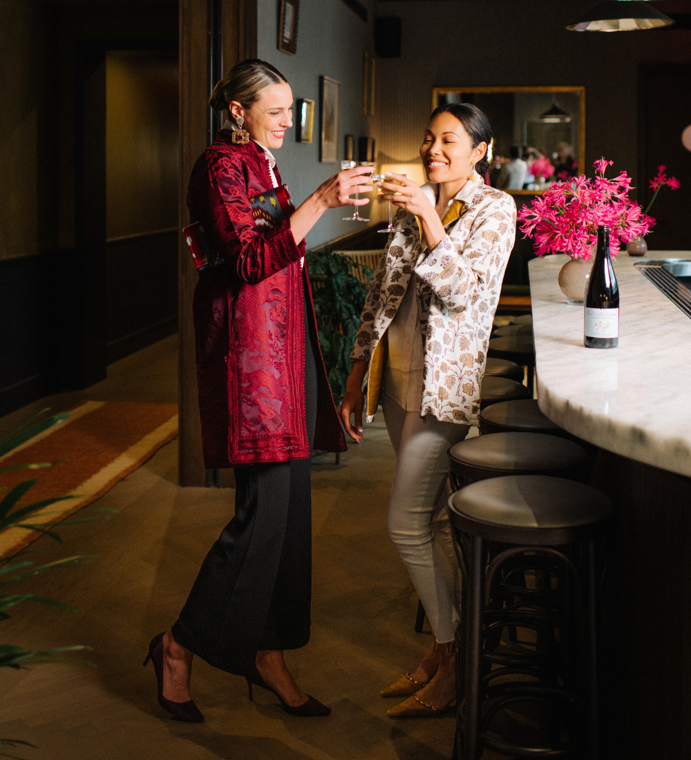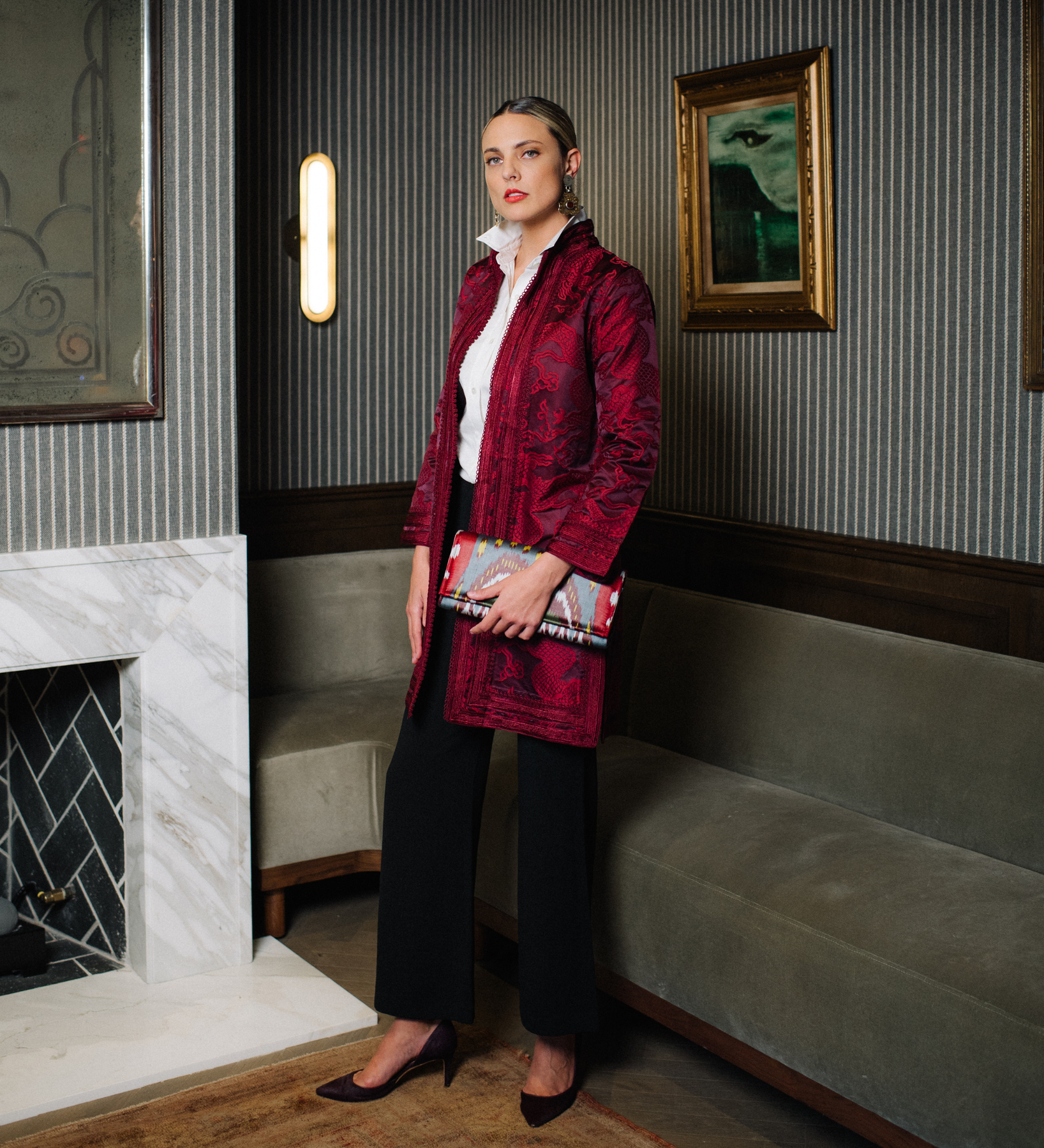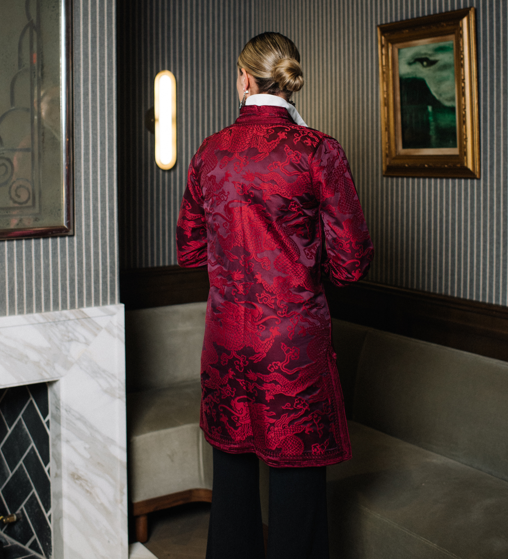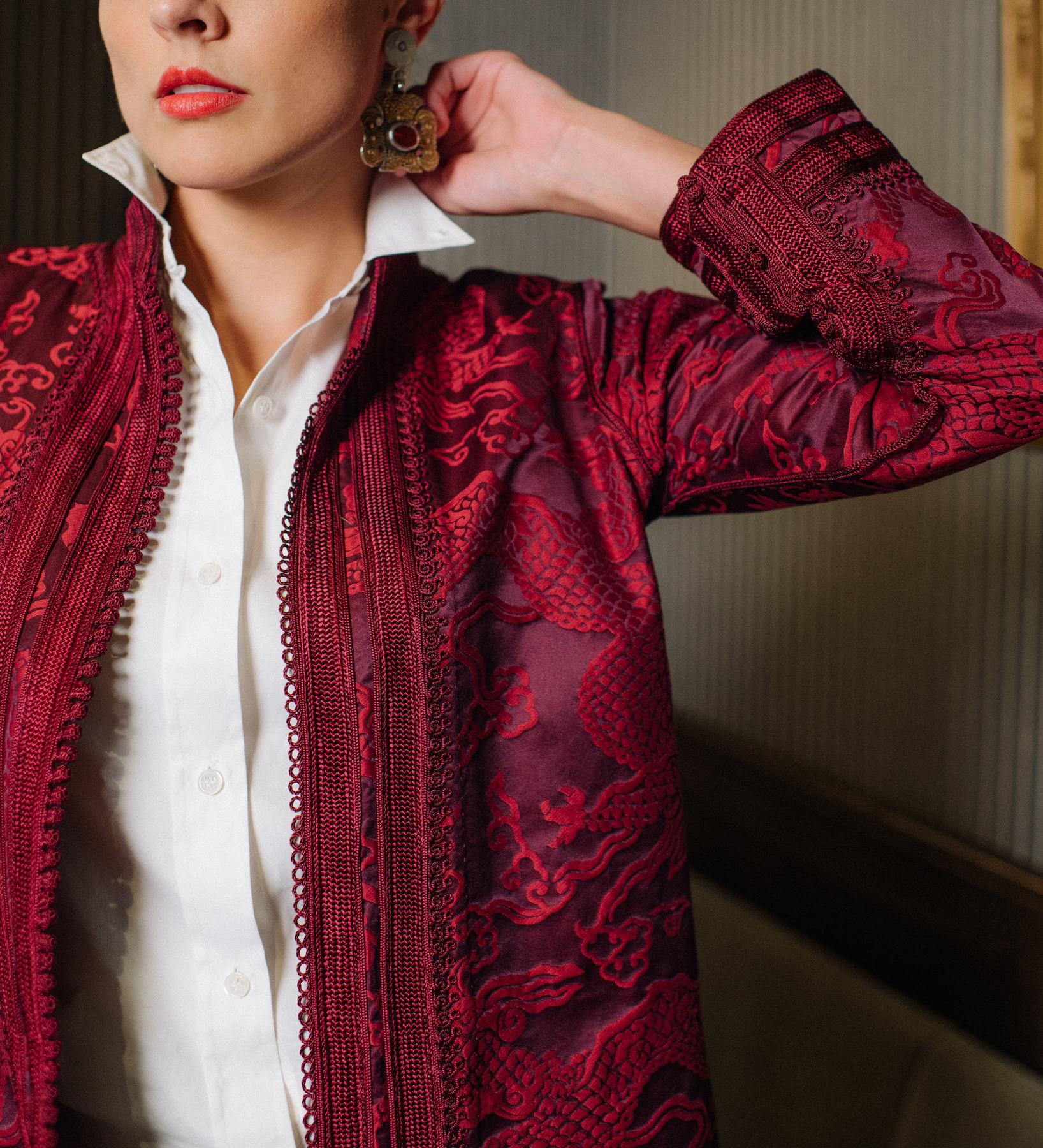 This limited-edition Moroccan jacket is crafted with Schumacher's Ruan Dragon Damask and embellished with soutache trim.