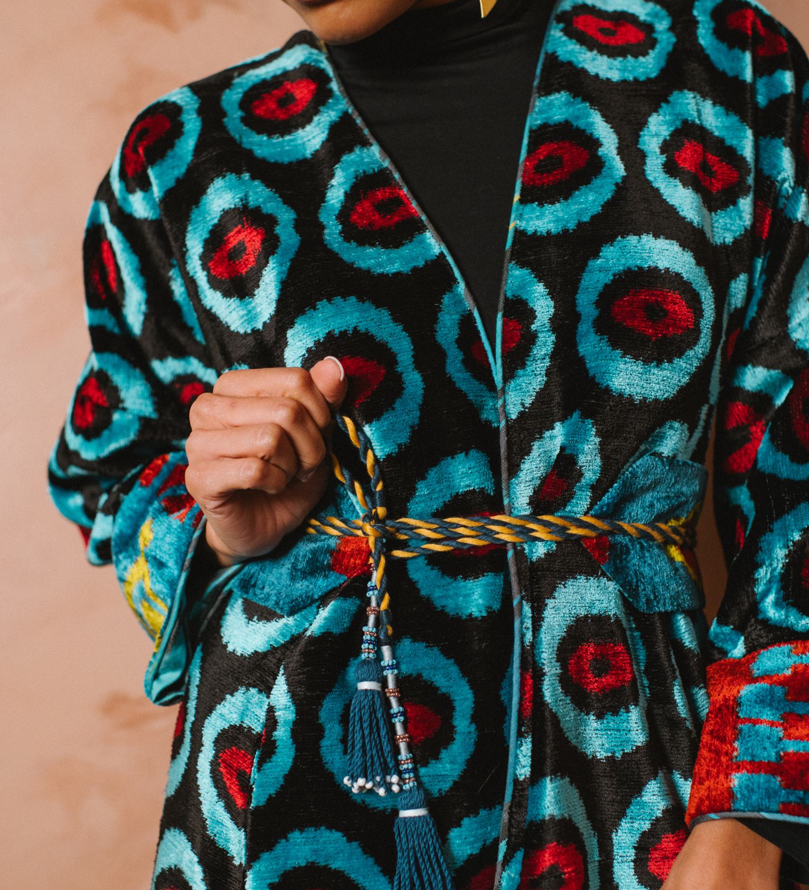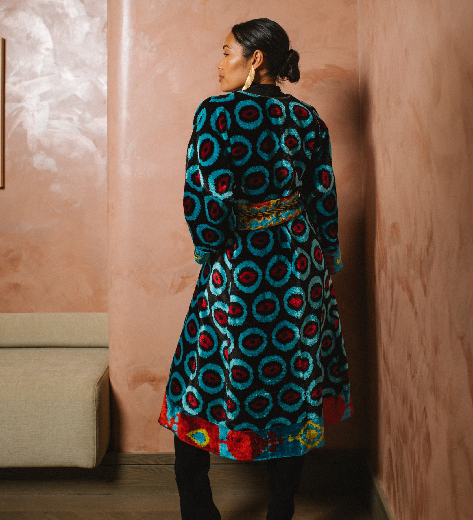 The age-old Uzbekistan tradition of ikat is stunning in a sweeping swing coat with a matching beaded sash.