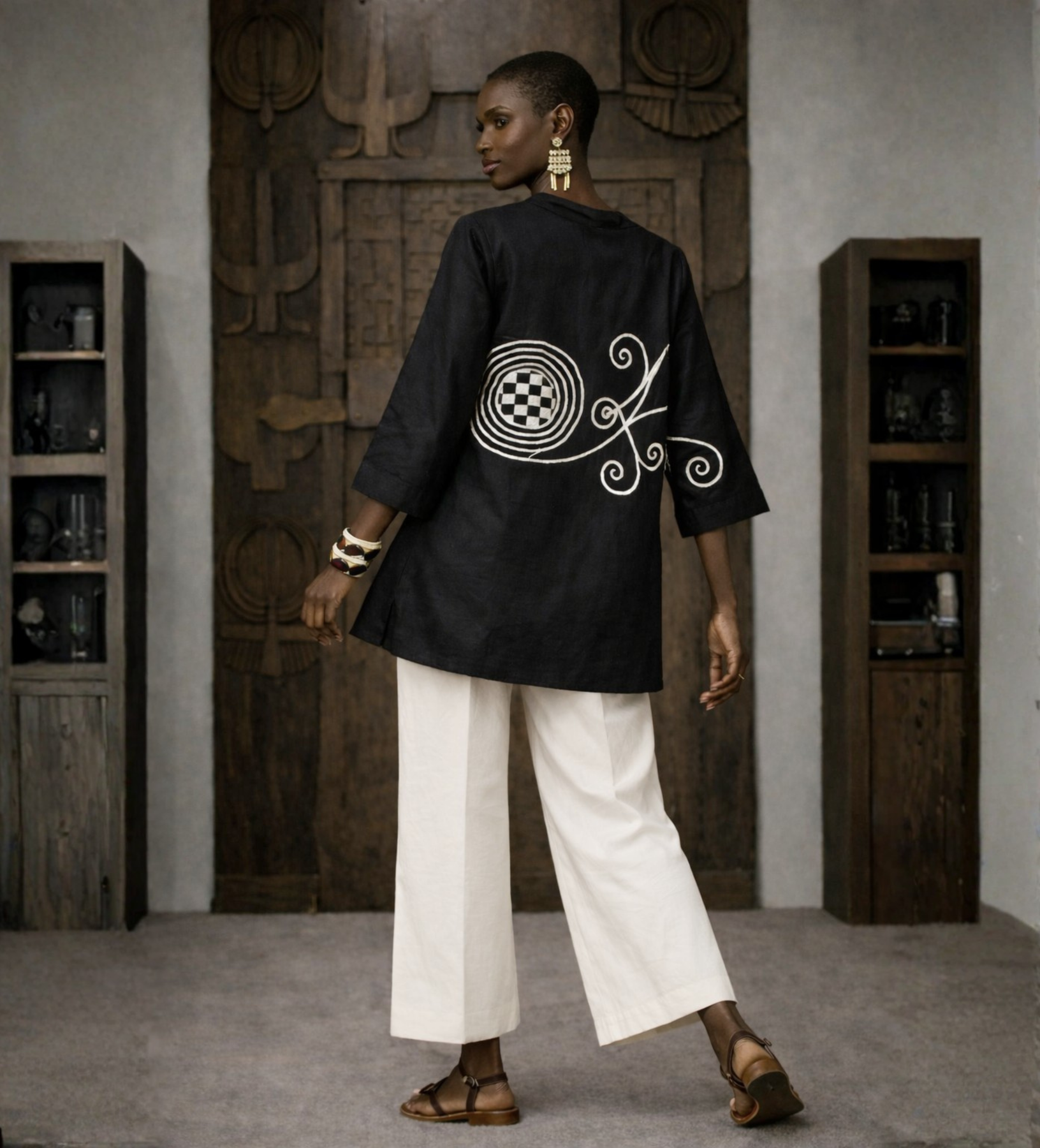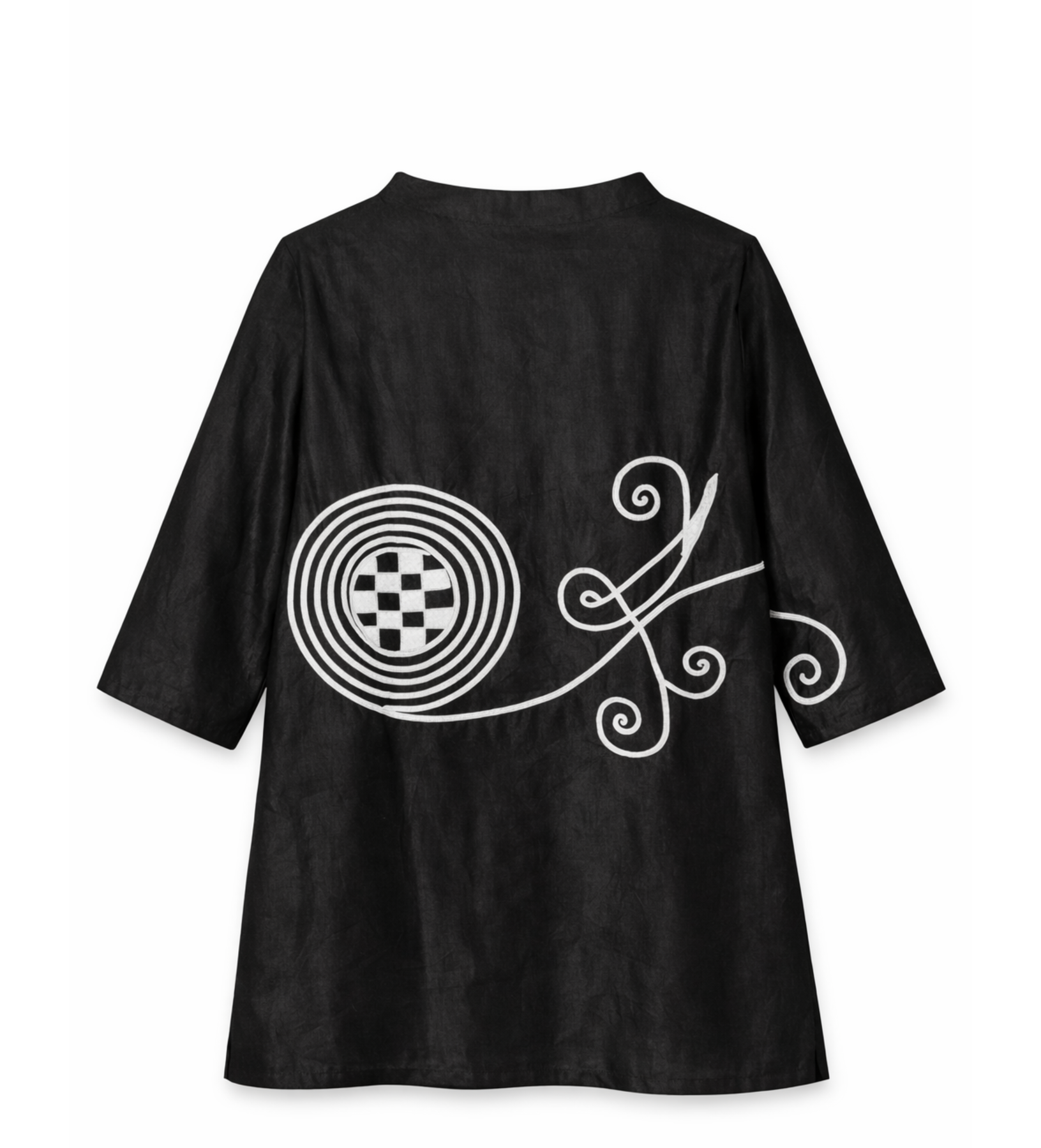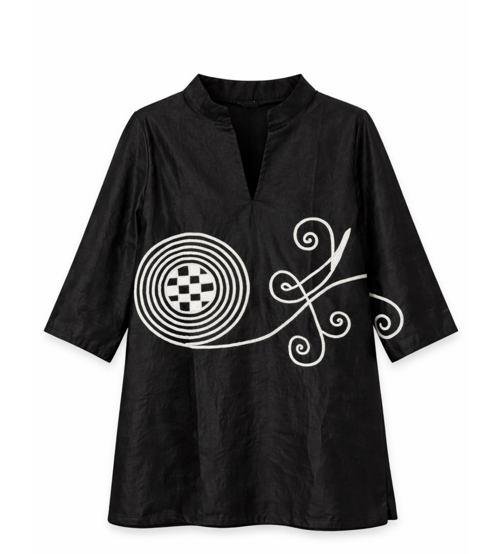 Handcrafted in Nigeria, this Hausa embroidered tunic in deep black is a bold study in line, movement, and meaning. The relaxed silhouette offers effortless ease, while the striking white embroidery flows across the body in a continuous, hand-drawn motif anchored by a circular form and extending into fluid, rhythmic lines. The design carries through to the back, creating a sense of motion and storytelling from every angle.