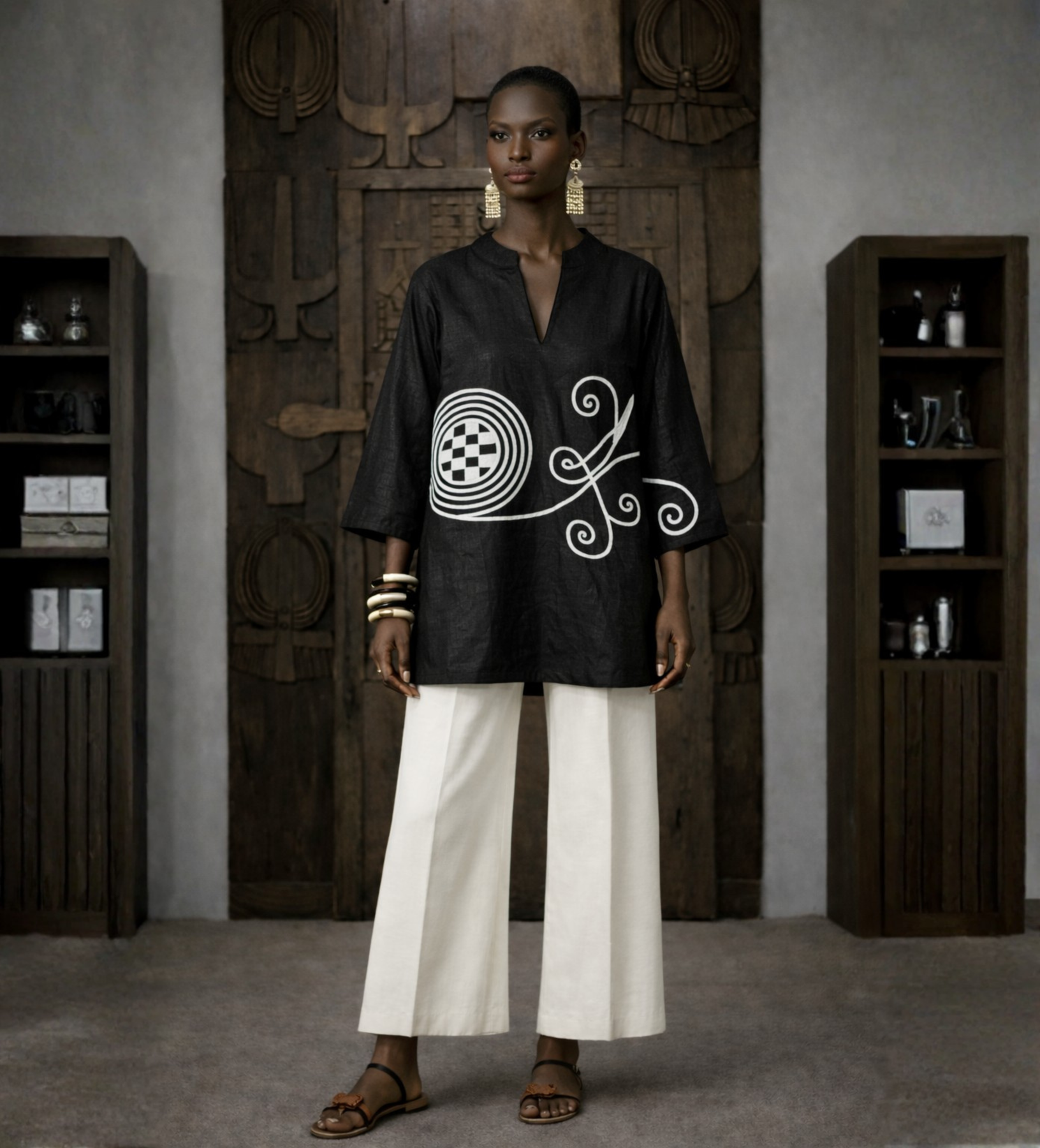 Set against the richness of black, the crisp white embroidery feels graphic, modern, and quietly powerful. Each piece is made by hand, reflecting the precision, artistry, and heritage of the women who create it. This is a statement piece that feels both grounded and expressive; timeless with an edge.