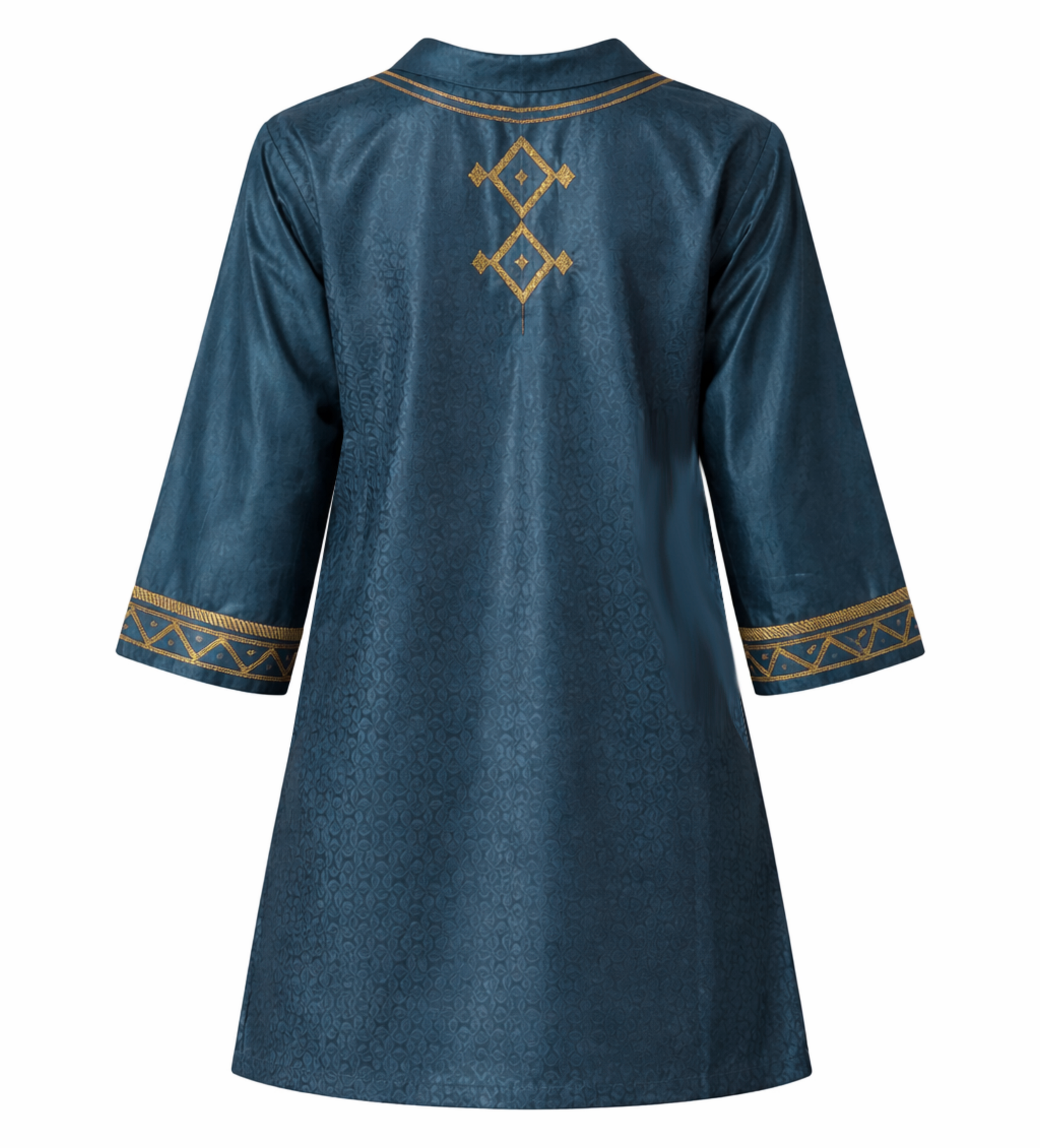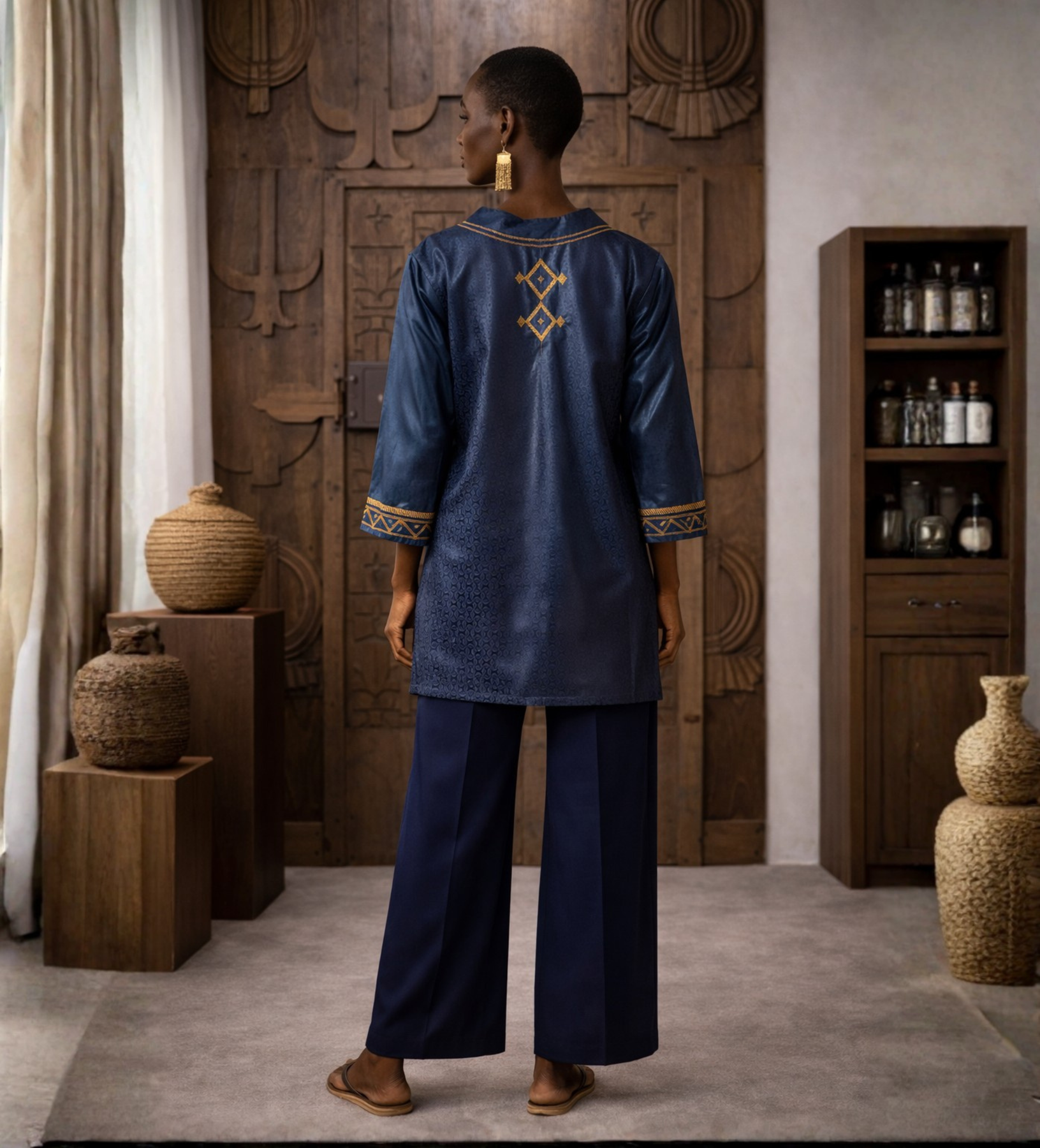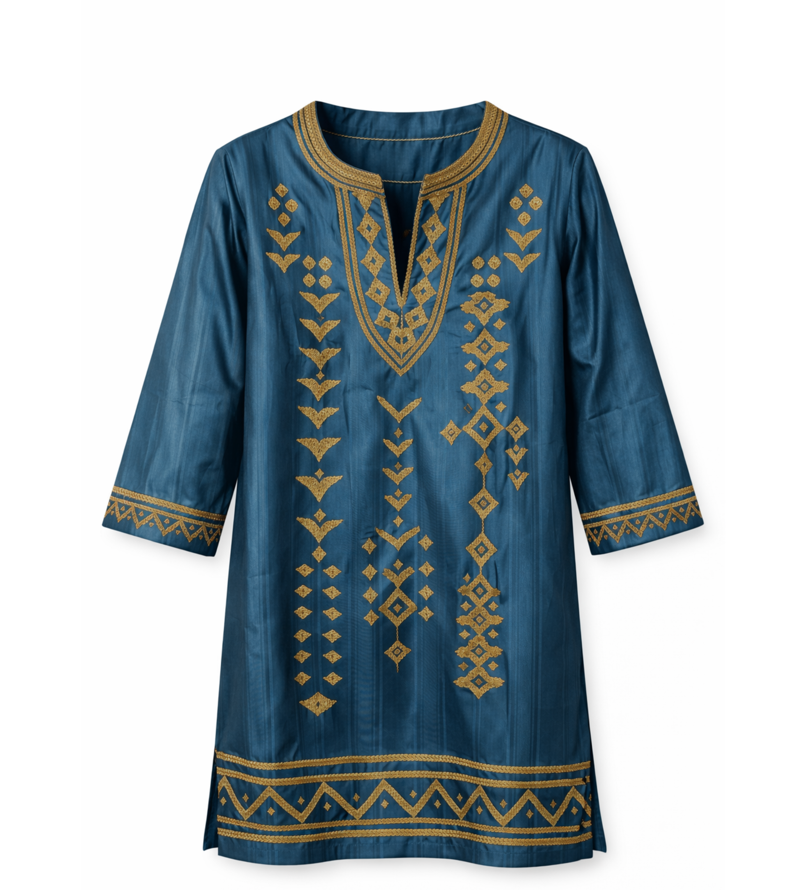 Handcrafted in Nigeria, this Hausa embroidered tunic is a study in balance. Cut in a relaxed silhouette, it falls effortlessly on the body, offering comfort without losing its refined shape. The rich teal cotton is elevated with delicate gold embroidery, thoughtfully placed to frame the neckline and create a subtle rhythm across the piece. Each stitch carries the hand of the artisan, making every tunic feel personal, intentional, and deeply connected to its origin. It’s the kind of piece that becomes a foundation in your wardrobe; timeless, versatile, and quietly striking.