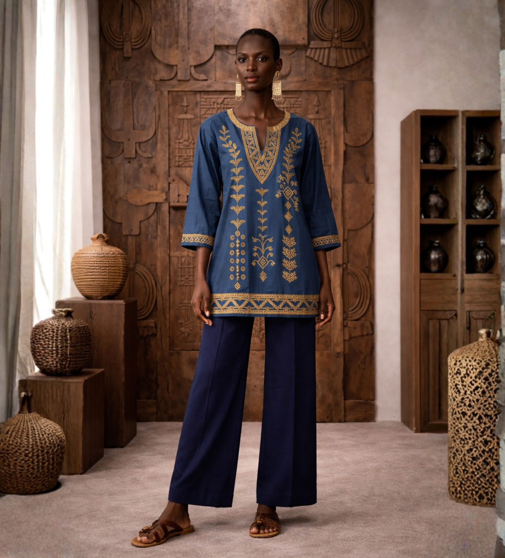 Stylist tip: Wear it with wide-leg trousers or soft cotton pants for a fluid, elongated look, and keep the footwear grounded with simple flat sandals. Add gold earrings or stacked bangles to echo the embroidery, and let the tunic remain the focal point. For a more relaxed feel, slightly roll the sleeves and wear it untucked and effortless.