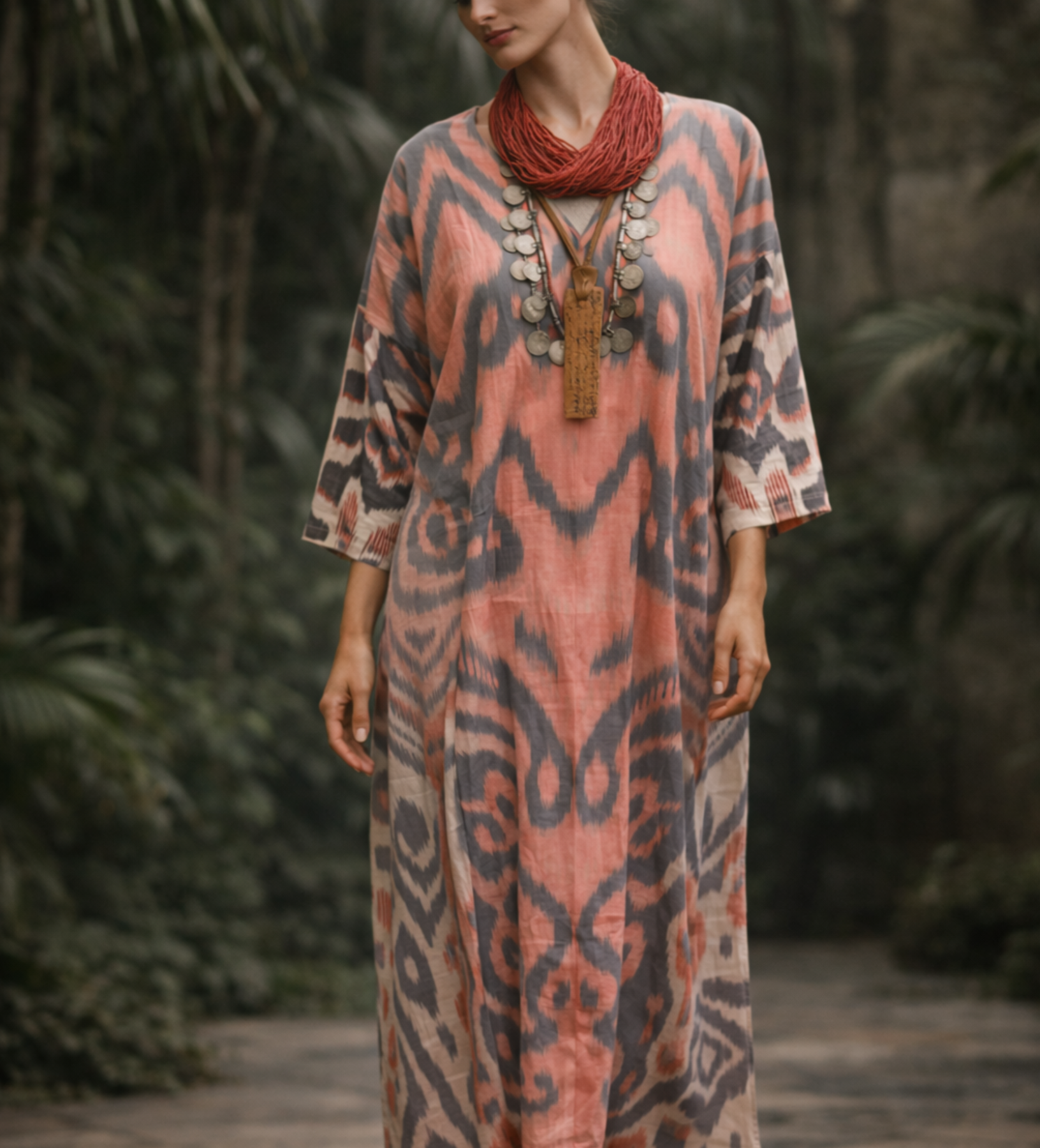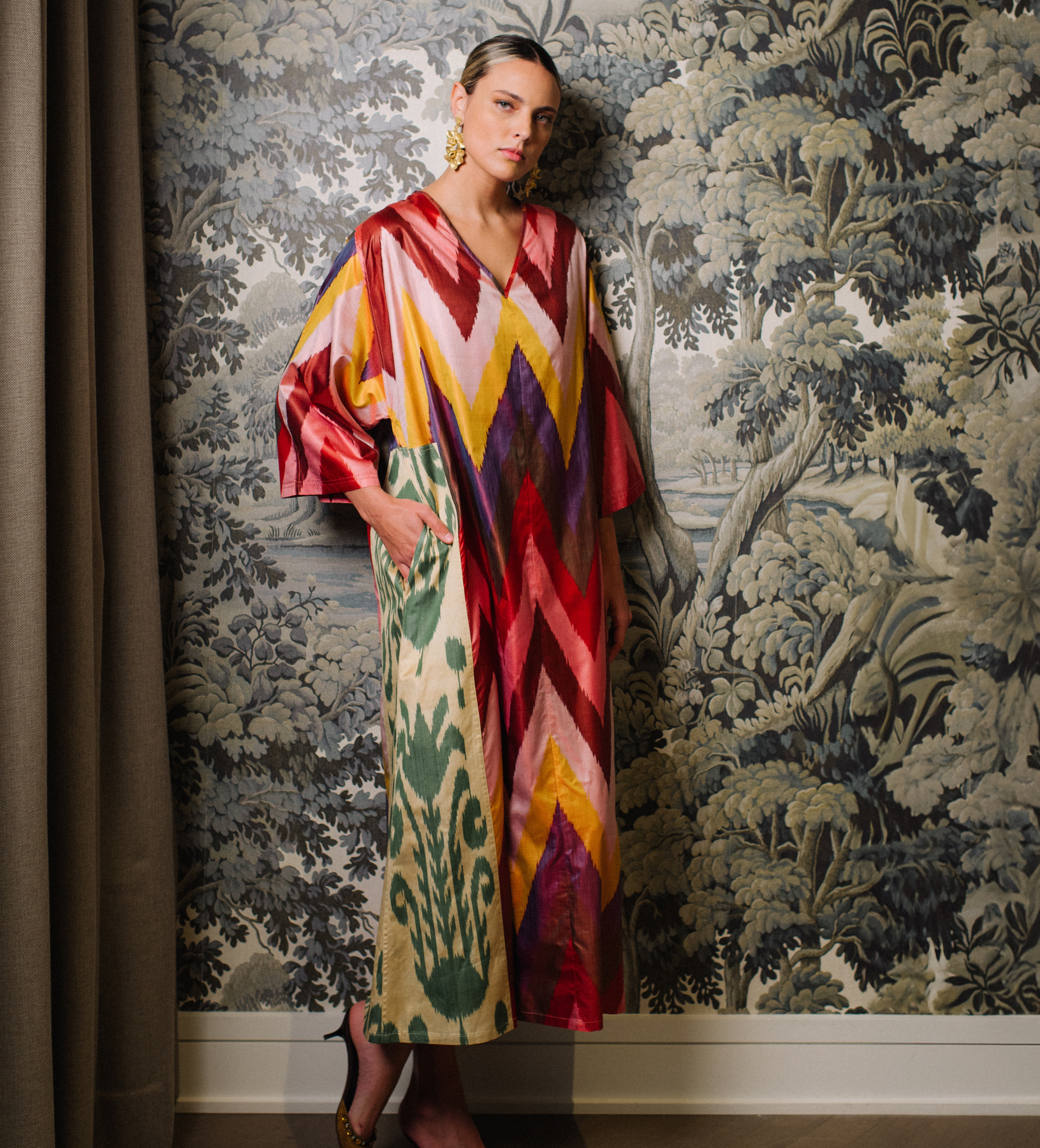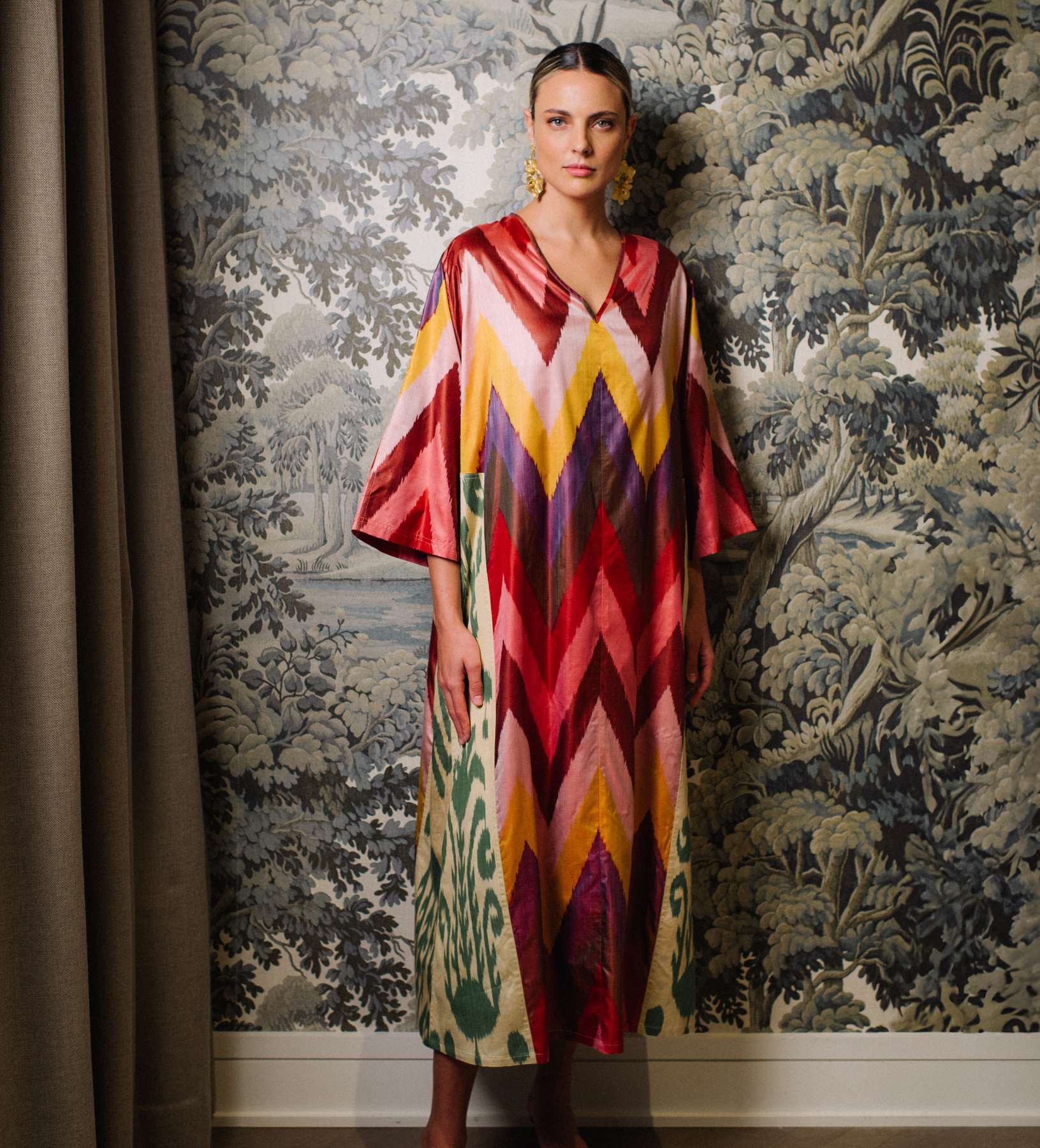 Easy, comfortable, and incredibly stylish, our voluminous caftans are silky smooth with plenty of room to play. Woven in traditional ikat, each pattern is unique and blurred, forming a delicate yet bold design.
