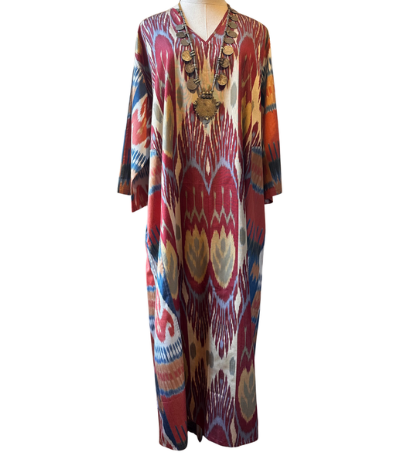 Stylist tip: this caftan is one size, but extra roomy to incorporate all body types. With gussets and voluminous sleeves, it will drape wonderfully on your frame.